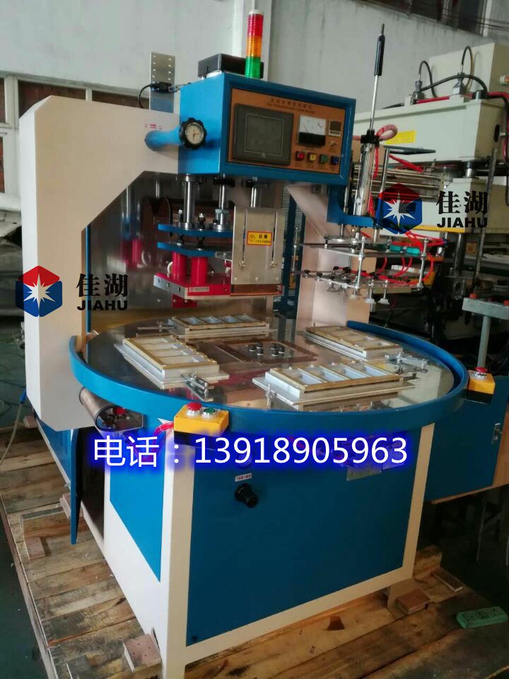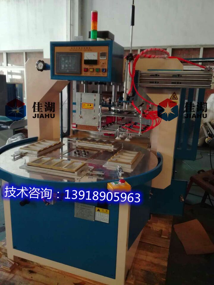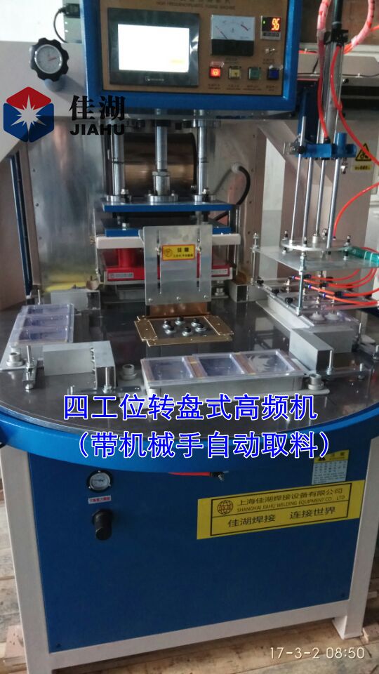 二、自動轉盤式高頻機特點: 1、多工位自動轉盤式高頻機有3~8工位,有標準型和PLC微電腦控制,多款機械根據客戶需求選擇供率大小,可根據客戶要求加裝熔斷功能,臺面大小,熔接次數,工位數選擇,自動放料系統和自動機械手自動取料等。 2、自動轉盤循環工作程序,采用分隔器和電機控制,工作穩定。 3、本機裝有高周回路,高周波輸出電力大,能使制品熔接,提高了生產產量。機器設有高周波頻率穩定器,以及高周波屏蔽裝置。將高頻干擾減少,避免電波干擾。使模具和物料損壞減少。