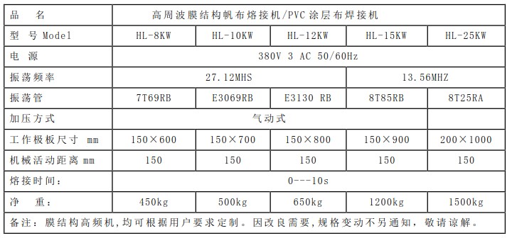 按客戶需求可定做各種非標膜結構高頻機、高周波蓬房拼接機、C型膜結構焊接機、帳篷蓬房熱合機、自動連續式噴繪布、拉漲膜焊接機等設備。