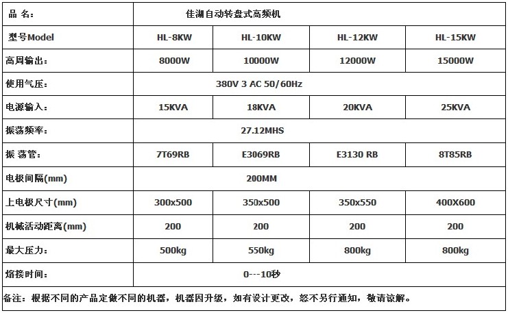 三、自動(dòng)轉(zhuǎn)盤式高周波熔接機(jī)的技術(shù)規(guī)格: