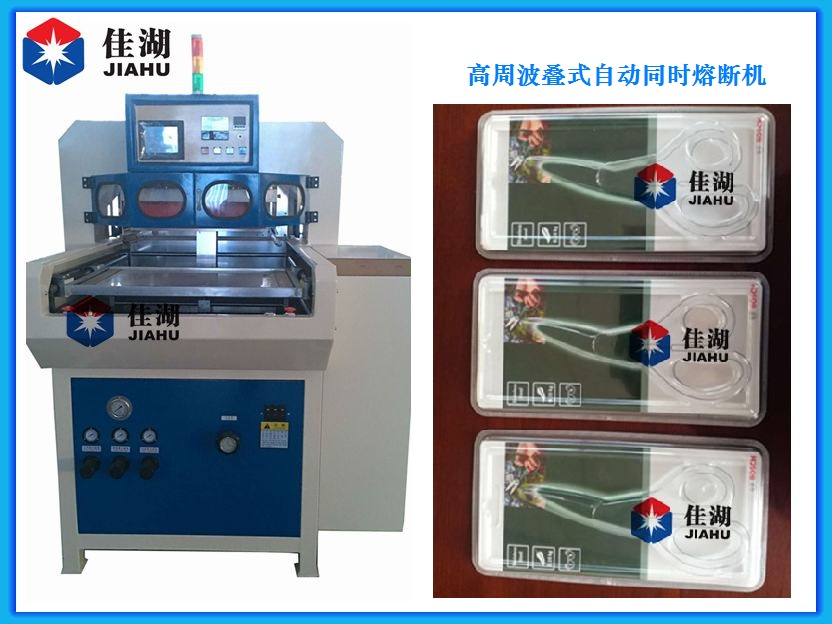 自動疊式高周波同步熔斷熔接機,采用上.下疊式連桿結構,節省設備占地面積,且只需一人操作即可,方便快速換模。