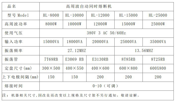 三、高周波自動同時熔斷機(jī)技術(shù)參數(shù):