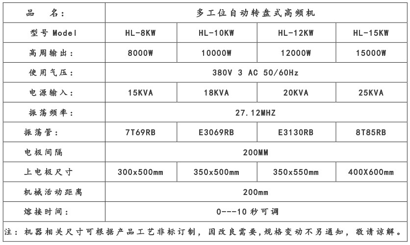 三、自動轉盤式高周波熔接機的技術規格: