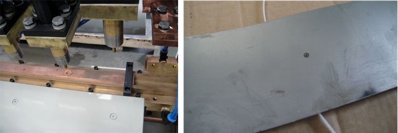 該機為與生產線配套一臺獨立的龍門式多點焊機。焊機兩側須配備鋼帶支承工作臺,工作臺應配備氣動壓緊機構。工件到達焊接位置后,先將前面的鋼帶壓緊。然后將后面的鋼帶按一定的搭接量放置并壓緊。檢查鋼帶焊接位置無誤后,啟動焊機,焊機下電極抬起與鋼板接觸,然后上電極從中間開始,一次壓下焊接2點,共焊5組10點。焊接完成后上下電極退回。焊機兩側的壓緊裝置松開完成一個工作循環。
