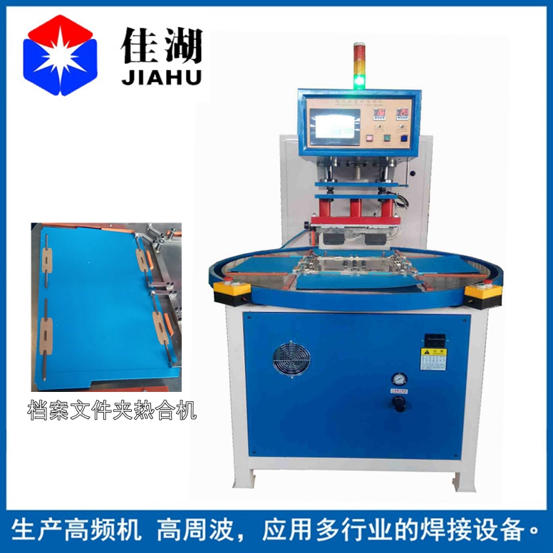 自動轉盤熱合機適用于:PVC文件夾,檔案文件夾自動熱合,四個工位自動轉盤,只需人工把產品放在熱合工作區模具對位好,自動熱合旋轉,熱合速度快。