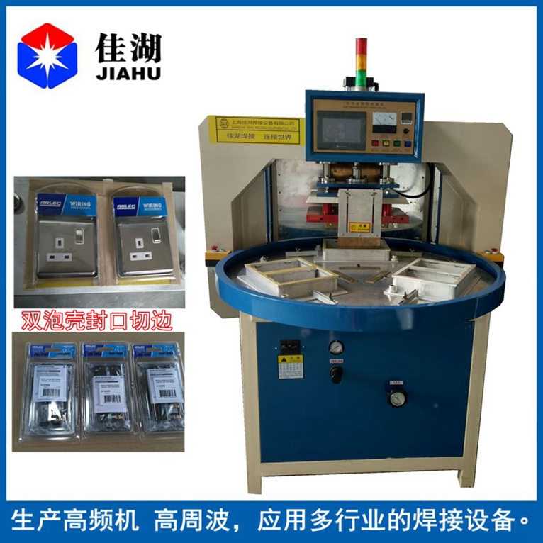 2.自動轉盤式高頻機又簡稱高周波:主要用于含30%以上各種聚氯乙烯(PVC)為主的塑膠熔接、焊接等,并將不同形狀泡罩或泡殼塑膠材質自動焊接同時自動切邊。適用于雙面吸塑焊接,吸塑泡殼與紙卡封合,吸塑包裝(包括上下雙泡罩熱合切邊,泡罩與紙板熱合),各種凹凸形狀的花紋圖案、字母文字的壓制等。