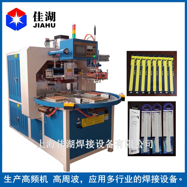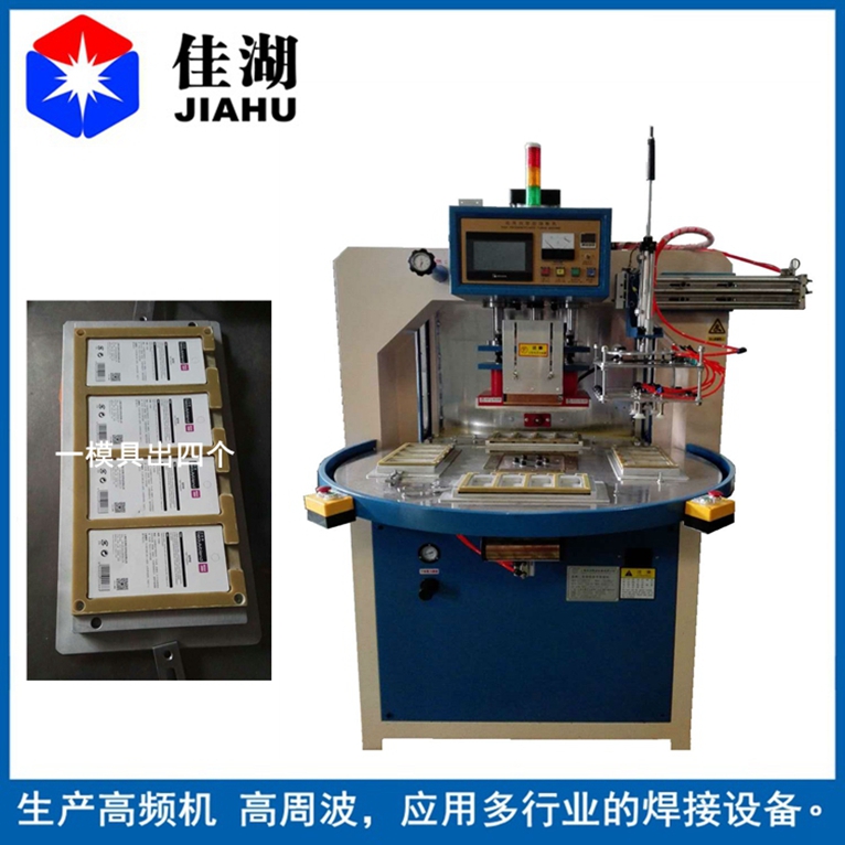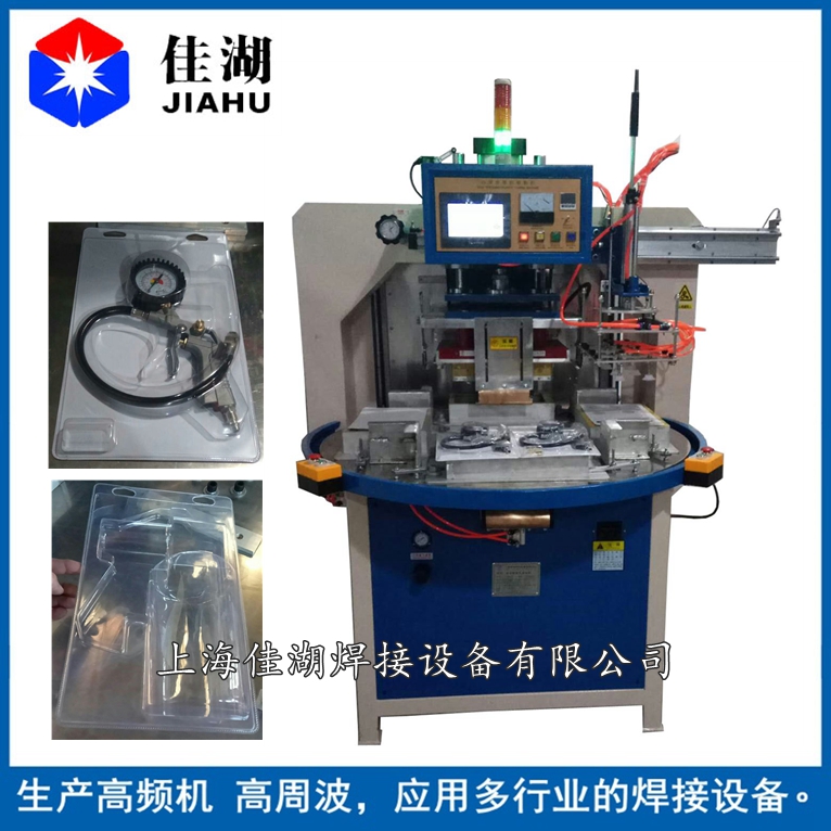 2.自動轉(zhuǎn)盤式高頻機又簡稱高周波:主要用于含30%以上各種聚氯乙烯(PVC)為主的塑膠熔接、焊接等,并將不同形狀泡罩或泡殼塑膠材質(zhì)自動焊接同時自動切邊。適用于雙面吸塑焊接,吸塑泡殼與紙卡封合,吸塑包裝(包括上下雙泡罩熱合切邊,泡罩與紙板熱合),各種凹凸形狀的花紋圖案、字母文字的壓制等。全自動轉(zhuǎn)盤,焊接速度快,適用于大批量紙卡泡殼之間的焊接。可選配帶機械手自動取料,節(jié)省人力。