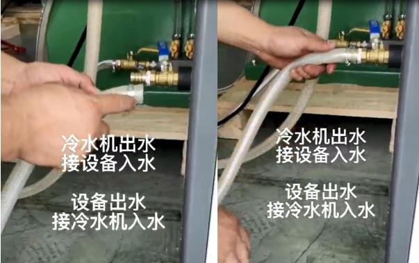 2、在接冷水機出入水,入水接通到設備接口處,在接好出水處;冷水機電源為220V在這里提示一下,如是380V三相五線制,三根火線,一根地線,一根零線,冷水機接頭電源后設置冷水溫度,一般溫度設為20°左右;見圖