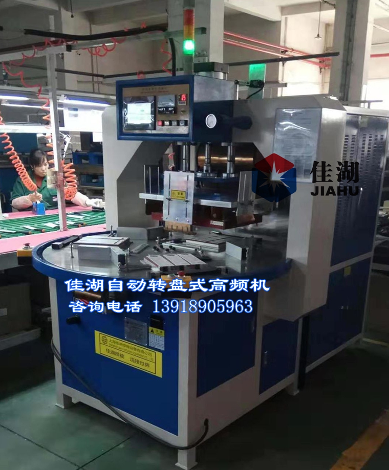 其實高周波和高頻機,高周波機,高周波熔接機,高周波塑膠熔接機,高頻熱合機是同一種機器設備,只是設備款式和型號不同,高頻機主要是用在塑膠熔接,PVC、PET、PETG、PU皮革,吸塑包裝,吸塑和紙卡包裝貼合,PVC軟膠袋,PETG吸塑泡殼封口、吸塑紙板封口、汽車座墊,汽車商標,汽車地墊腳墊,暖水袋,電池包裝封口,U盤吊卡吸塑包裝封口、吸塑泡殼封口、PVC塑料泡殼封口、PVC泡殼焊接、PVC塑料泡殼焊接、高頻塑料焊接、高周波塑膠封口、雙面泡殼封口、電池吸塑吊卡包裝封口、五金工具封口、雙面泡殼封口、PVC雙面泡罩封口、雙面紙板泡殼封口、紙板泡罩封口、塑膠塑料熱合焊接等:具體高頻機可壓的產品歡迎咨詢上海佳湖焊接設備公司.以下是自動轉盤式高頻機設備。